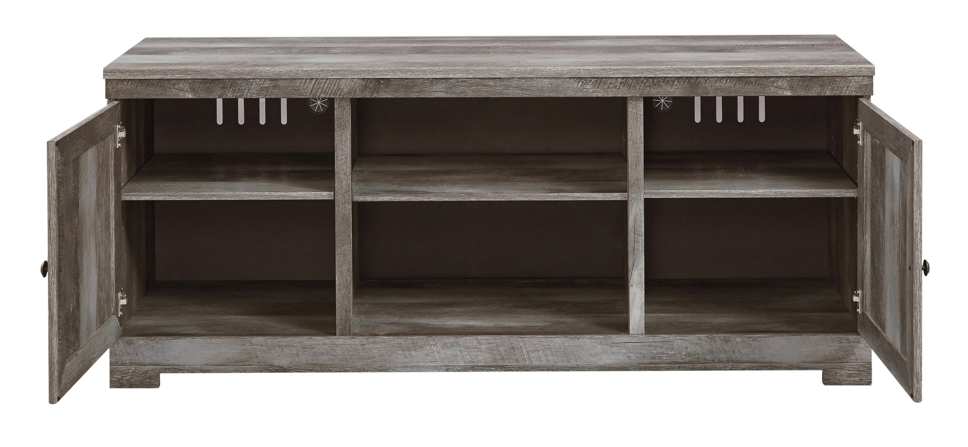 | Details | Made with engineered wood (MDF/particleboard), Rustic gray finish over replicated oak grain, Plank effect, TV stand with 2 storage cabinets (each with an adjustable shelf) and removable/adjustable center shelf, Each pier with 2 glass shelves and cabinet door revealing single-shelf storage; overhead LED lighting; reversible cabinet doors can open left or right with consumer assembly modification , Cutouts for wire management and ventilation, Assembly required | |
